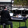 Kun ved hjelp av et elektronisk flygel og sin egen stemme har han tolket en rekke kjente salmer for publikum.