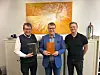 LANSERER: HybridInitiativtaker og skrivende redaktør Sten Sørensen i midten sammen med forslagsjef i Hermon Forlag, Svein Andersen, til venstre. Til høyre: Leif Kåre Lysåker, prosjektleder og konseptutvikler.