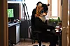 En plakat med «Benjamin» i store bokstaver står bak Beethoven-noter på det elektriske pianoet. På skrivebordet under loftsengen troner to store dataskjermer ved siden av en sjakkbok.