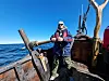 VED RORET: Lørdag seilte Vikingskipet Saga Farmann ut fra Tønsberg og Vikingodden med kurs for Lübeck. Kjersti Marken bytter på å stå ved roret.