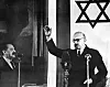 FØRSTE PRESIDENT: I årene etter første verdenskrig var det ikke på tale å opprette en egen jødisk stat. Dr. Chaim Weizmann, en ledende representant for jødene, ga klart uttrykk for dette både overfor araberne og britene. På bildet sverges han inn som Israels første president i 1949.