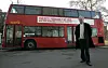 ATEISME: Professor Richard Dawkins, poserer foran en London-buss med den ateistiske reklamen med slagordet: «Det er sannsynligvis ingen Gud. Slutt å bekymre deg og nyt livet ditt.»