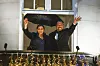 FREDSPRISVINNER: Etiopias statsminister Abiy Ahmed og hans kone Zinash Tayachew på balkongen på Grand Hotel under fakkeltoget i forbindelse med tildelingen av Nobels fredspris i Oslo i fjor.