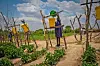 FASTEAKSJON: Ved hjelp av ganske små dropar vatn og dryppirrigasjon kan det vekse planter. Her fyller Prevencia frå Zambia vatn i bøtter, og vatnet blir ført ut gjennom tynne slangar til plantene.