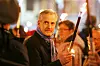Bildet viser statsminister Jonas Gahr Støre delta i et fakkeltog og en markering over minnet om Krystallnatten.