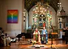 KIRKEMØTET: Biskop i Bjørgvin Halvor Nordhaug og Hamar biskop Solveig Fiske på åpningsgudstjenesten under Kirkemøtet 2022. Innsenderen reagerte på bildet med krusifikset i pridefarger.