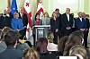 GEORGIA: På bildet tatt fra video snakker Georgias president Salome Zourabichvili, i sentrum, omgitt av opposisjonsledere til media etter parlamentsvalget i Tbilisi, Georgia, søndag 27. oktober 2024.