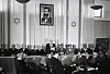 ISRAEL: David Ben-Gurion (Israels første statsminister) uttalte offentlig erklæringen om staten Israel, 14. mai 1948, i Tel Aviv, Israel, under et stort portrett av Theodor Herzl, grunnleggeren av moderne politisk sionisme.