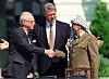 1993: Israels statsminister Yitzhak Rabin og palestinernes leder Yasser Arafat tar hverandre i hånden ute på plenen foran Det hvite hus.