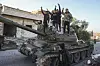 ALEPPO: Støttespillere for den syriske opposisjonen står på en erobret syrisk militærvogn i byen Maarat al-Numan, sørvest for Aleppo, Syria, lørdag 30. november 2024. Tusener av syriske opprørere har inntatt Aleppo dagen etter å ha stormet byen med liten motstand fra regjeringsstyrkene.