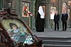 MILITÆRGRØNN KIRKE: Patriark Kirill, president Vladimir Putin og forsvarsminister Sergei Shoigu deltar under en markering i den nye katedralen i Patriotparken ved Moskva.