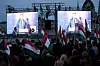 TALTE: På en storskjerm ved elvebredden av Donau, rett overfor parlamentet, holdt opposisjonsleder Peter Magyar en tale litt før de første valgresultatene begynte å komme.