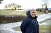 Han har parkert bilen i den gruslagte oppkjørselen og ruslet til fremsiden av boligen. Eplehagen går over i åker og marker som fortsetter ned til Norges største innsjø.