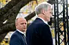 HURDAL: Ap-leder Jonas Gahr Støre og Sp-leder Trygve Slagsvold Vedum legger fram regjeringsplattformen ved Hurdalsjøen hotell.