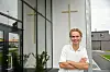 Korset lyser opp i den solbrune halsen til Asle Haddeland, idet han ønsker velkommen inn i Kleppe bedehus i Rogaland.