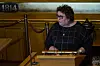 KrF-leder Olaug Bollestad på talerstolen i Stortinget etter statsministerens redegjørelse om krigen i Ukraina.