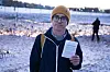 På minneplassen ved skolen står en ung mann alene i skumringen og deler ut flyveblader.