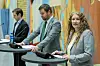 FORNØYDE: Leder av finanskomiteen Tuva Moflag (Ap), Geir Pollestad (Sp) og Andreas Sjalg Underland (SV) er fornøyde med å være i havn med budsjettforhandlingene.