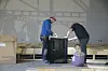 Store gipsplater kjem subbande på fire bein over spongolvet. Dei skal bli himling i hovudsalen i det nye bedehuset i Sævelandsvik. To og to mann bukserer platene på plass. Stemmene er lystige og stemninga god.