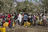 Folk som er drevet fra sine hjem som resultat av konflikten i Tigray, står i kø for å hente vann i en provisorisk flyktningleir som er satt opp i Shire i regionen. Foto: International Rescue Committee via AP / NTB