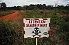Sikkerhetssituasjonen i Den sentralafrikanske republikk har forverret seg de siste årene. Fem humanitære grupper trekker seg ut av landet som følge av en rekke angrep i 2017. Bildet viser et skilt som advarer reisende på vei gjennom Bambari midt i landet. Foto: AP / NTB scanpix.