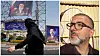 SYNLIG: Trafikken passerer skilt av ayatolla Ali Khamenei som ble drept 28. februar og hans etterfølger Mojtaba Khamenei. Til høyre forsker Joseph Salomonsen.