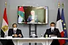 Frankrikes president Emmanuel Macron (t.h.) og Egypts president Abdel Fattah el-Sisi holdt tirsdag et videomøte med Jordans kong Abdullah. De tre ble blant annet enige om en resolusjon om våpenhvile i Gaza-krigen. Foto: Sarah Meyssonnier / pool via AP / NTB
