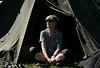 Hun sitter i teltåpningen på Dyrskuplassen i Seljord. Det er 26 varmegrader.