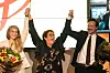 JUBEL: Partileder Olaug Bollestad jubler sammen med nestlederne Dag-Inge Ulstein og Ida Lindtveit Røse under KrFs valgvake på Mesh i Oslo.