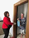 PRAKTISK HJELP: Eva Takvam i sjømannskirken i Alanya forteller om en vanskelig tid for fastboende nordmenn i byen. Her leverer hun matpose til Sissel Svalland i fjor vår da alle over 65 år i Tyrkia hadde tre måneders portforbud hele døgnet.