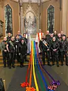 Bildet viser domprost Stig Lægdene og biskop Olav Øygard sammen med og flere deltakere i lærantrekk, inkludert den regjerende Mr. Fetish Europe, herr «Puppy Ireland» og «Mister Leather Berlin».