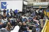 FREDAGSBØNN: Et hundretalls muslimer i bønn ved Damaskusporten. Fredag var det ikke adgang til Tempelplassen for menn under 50 år på grunn av opptøyene som har vært der de siste dagene. Den sterke reaksjonen på dette uteble på grunn av storstilt oppbud av politi og soldater og fordi regnet strømmet ned da fredagsbønnen var ferdig og opptøyene skulle begynne. John Solsvik