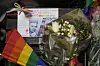 OSLO: Blomster og regnbueflagg er lagt ned utenfor Nationaltheatret for å hedre den avdøde Kim Friele. Hun døde mandag kveld. Foto: Fredrik Hagen / NTB