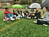 Skolelaget på Sagatun har lagslunsj på fotballbanen. F.v.: Eyuel, Madeleine, Amalie, Kaja Emelí, Elim, Ester og Malin .