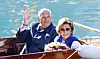 Kong Harald og dronning Sonja på vei inn til Valldal i Fjord kommune med båt sommeren 2022.