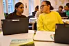 Houaida fra Libanon sitter på første rad i klasserommet.