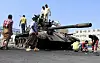 Folk har samlet seg ved en utbrent stridsvogn i den jemenittiske havnebyen Aden mandag. Foto: Reuters / NTB scanpix