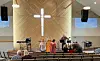 En håndfull mennesker sitter spredd i kirkebenkene og synger med. En av dem er et eldsterådsmedlem som sitter på fremste benk sammen med to barn som spiller på tamburin. Da etternølerne er på plass, består forsamlingen av tolv mennesker.
