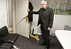 ØDELEGGELSER: Pastor Eilif Tveit med en av mange ødelagte dører som møtte kirkegjengerne i Misjonskirken i Lyngdal søndag. Foto: Lars Rekaa, Lyngdals Avis