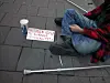 Oslo 20040513. En tigger sitter på gata i Oslo Sentrum med et pappkrus, krykker og et skilt som sier: Trenger hjelp til å unngå kriminalitet. Tiggere Foto: Berit Keilen / SCANPIX NB: Fått lov av modell