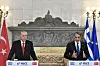BEHANDLER SOLDATER: Hellas' statsminister Kyriakos Mitsotakis (til høyre) og Tyrkias president Recep Tayyip Erdogan fotografert da de møtte pressen i Aten i desember. Mandag var Mitsotakis i Tyrkia.