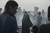 HARDE KAMPER: Palestinere på stedet der minst 45 mennesker ble drept i et israelsk angrep søndag. Angrepene mot området fortsatte tirsdag, opplyser øyenvitner, som sier at mange har flyktet i løpet av natten.