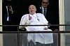 Han vinket deretter fra rullestolen sin til de mange menneskene utenfor sykehuset. De applauderte ham og laget korsets tegn. Paven ga en tommel opp før han ble rullet av balkongen.