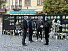 KRIGSOFFER: Fra venstre: Helge Nupen, Øystein Gjerme og Arve Bækkelund får omvisning i byen Mukachevko i Svaljava-regionen, vest i Ukraina. I bakgrunnen minneplakater for ukrainske soldater som har falt under krigen.