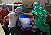 VESTBREDDEN: Palestinske demonstranter brenner et israelsk flagg ved Ofer-fengselet i landsbyen Betunia på Vestbredden 16. mai 2014, dagen etter at to palestinske ungdommer ble skutt og drept samme sted. En israelsk politimann er nå siktet for uaktsomt drap på den ene ungdommen. Foto: AFP / Abbas Momani / NTB Scanpix.