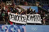 FOLKEMORD: «Folkemord-olympiaden» stod det på to store hvite laken som vaiet mens Israel spilte kamp mot Paraguay i Parc des Princes OLi Paris på lødag 27. juli. (AP Photo/Aurelien Morissard)