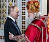 FÅR STØTTE: Patriark Kirill har bedt om internasjonal kirkestøtte i kampen mot den nye religionsloven i Ukraina. Bildet viser patriarken og president Vladimir Putin under en gudstjenestes i Moskva i mai i år.