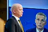 Finansminister Trygve Slagsvold Vedum (Sp) kunne fredag presentere Jens Stoltenberg som ny sentralbanksjef. Stoltenberg deltok digitalt fra Brussel. Foto: Terje Bendiksby / NTB
