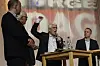 DEBATT: Helbredelsespredikant Svein-Magne Pedersen holder en hånd i luften under debatten med blant andre VGs sjefredaktør. Foto: Bjørn Olav Hammerstad
