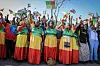 Kvinner kledd i Etiopias nasjonalfarger demonstrerer i Addis Abeba for statsminister Abiy Ahmed og mot TPLF søndag. Foto: AP / NTB
